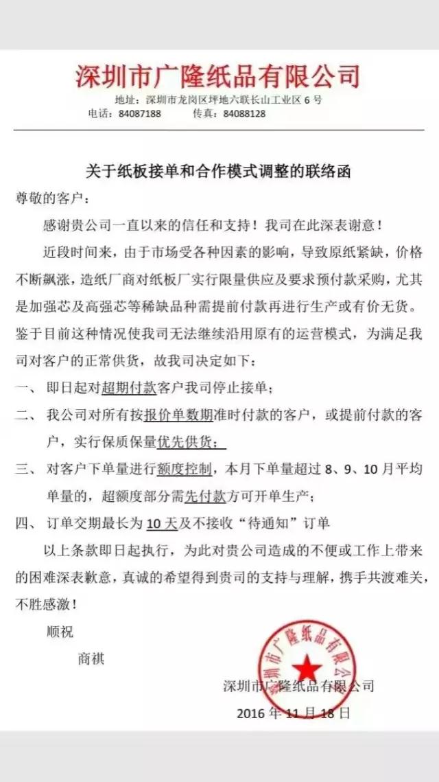 11月19号我不知道别的地方,我知道深圳的原材料紙張漲瘋瞭,一時間所有的包裝行業印刷行業朋友圈都在轉發,我開始憤怒瞭這是要逼著印刷廠都關門嗎?對你們有好處嗎原材料的廠商,你們不想讓我們接單瞭想讓我們斷糧食瞭,沒有紙的日子特别難熬,漫天飛的漲價聯絡單與限産單通知,沒有紙的日子特别難熬,爲什麽說紙價瘋漲也沒人管?並不是要故意制造恐慌,也不是要哄擡紙價 。就幾天時間公司接到好幾張漲價的通知單,我說如果你告訴客戶他們肯定不願加他的價,這樣的話我們印刷廠就不好接單不好操作,你不可能一一的爲你的客戶去解釋吧,就算他們願意聽我們也沒那麽多時間,換個角度如果印刷廠集體罷工的話,那你們紙廠還有什麽資格是合夥漲價,本身今年明年印刷行業都是很困難的,這個雪上加霜的時候還漲價都不知道報的什麽心态。反正我是有圖有真相的等會有同行的可以看看,大家互相轉發抵制他們原材料漲價。深圳市博霖印刷感謝一路支持的客戶和供應商們特殊時候換位思考謝謝。