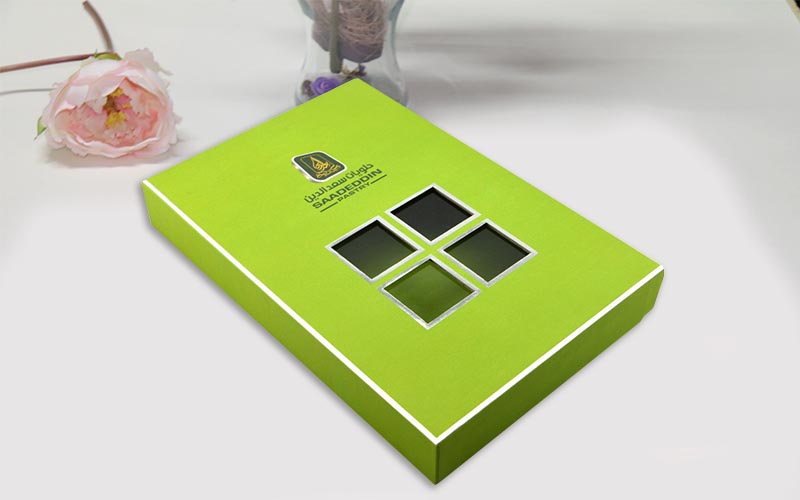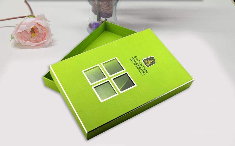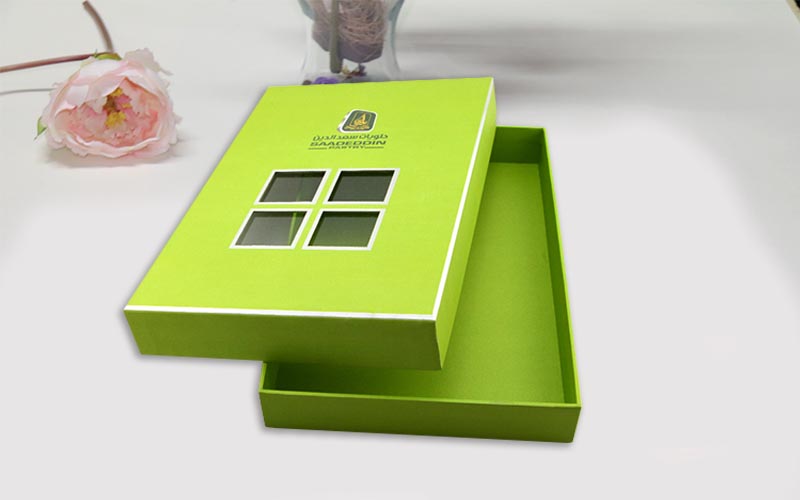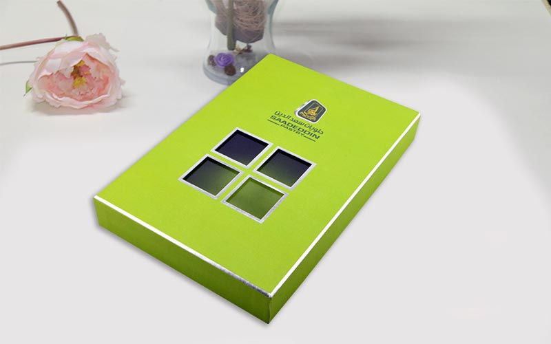 1.材質:盒子面紙用銀卡紙四色印刷,盒子底部打白墨,單面啞膜裱1500G雙灰闆,盒子内部裱一層染色紙,盒型爲天地盒上盒蓋開窗可以隐約看到裏面的産品,更有一種神秘感,流水線制作。