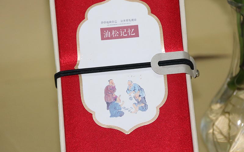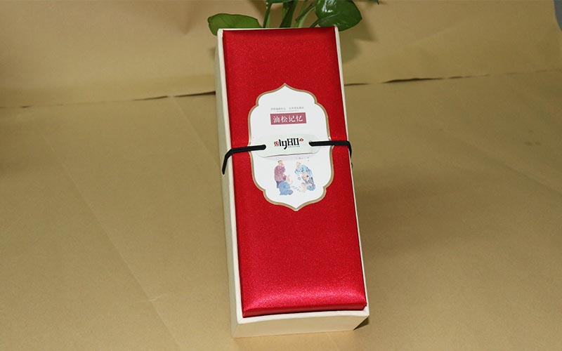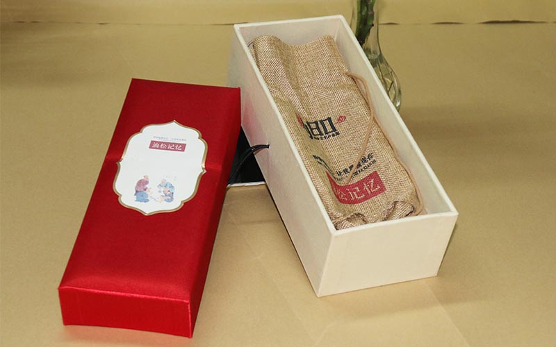 1.材質:上蓋用中國紅綢布裱1500G灰闆,盒子正面裱一層1CM厚度的海綿,異型粘彩色不幹膠,底盒米色帶紋路的特種紙,裱1500G雙灰闆。盒身左右兩側穿一根黑色松緊帶,盒子内部用坑紙做内托,裏面放一個麻布袋子。整款盒子手工制作。