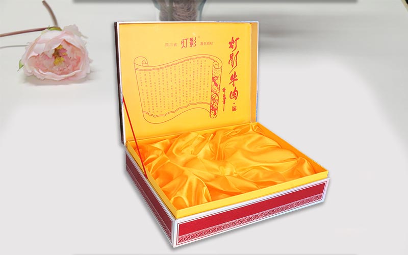 1.材質:盒子採用銀卡紙打底色白墨,彩色印刷+一層皺紋UV油,裱1500G雙灰闆上蓋墊一層2MM厚度的海綿,盒型是有内圍條的天地盒盒型爲翻蓋盒内托珍珠棉裱一層金色絨布,手工制作