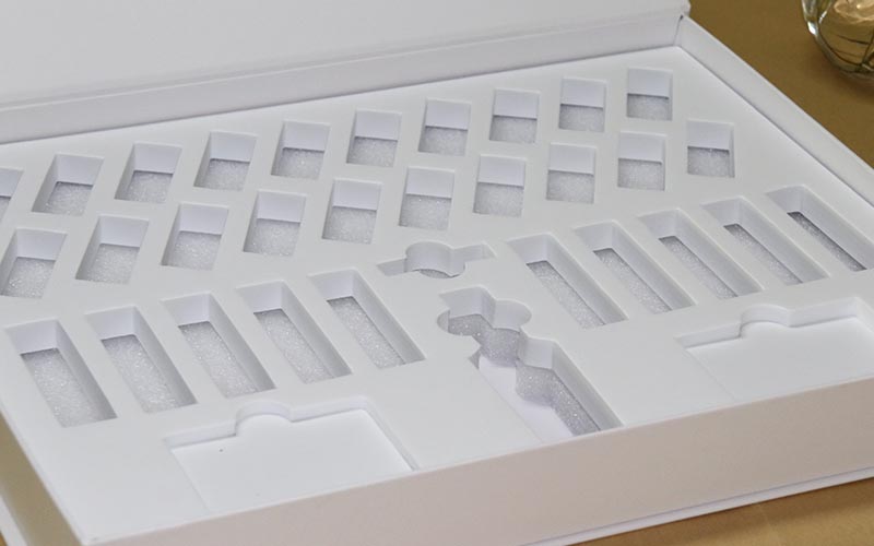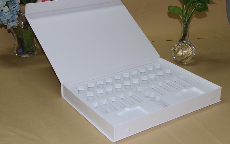 1.材質 :盒子面紙用157G銅版紙單面彩色印刷,單面覆亞膜,裱1300G雙灰闆,内盒也是一樣的材質工藝,内托2層珍珠棉表面粘一層EVA,開模固定好産品,防止産品在裏面來回晃動,盒子比較大都是手工制作。