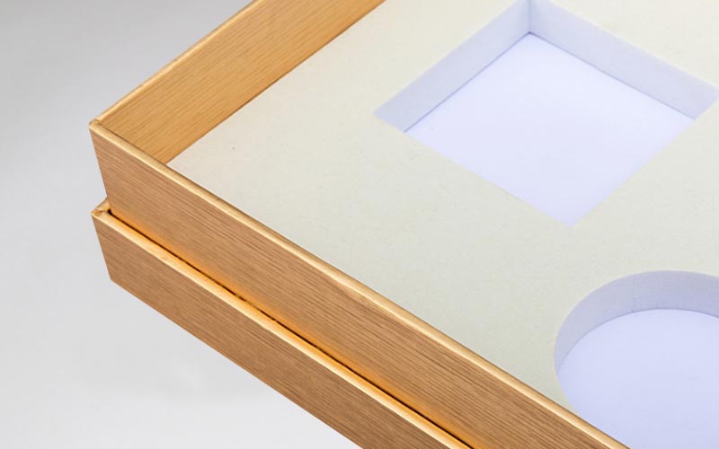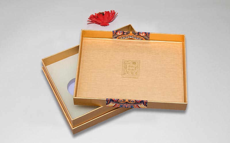 1.材質 :盒子面紙用帶紋路的特種紙,表面在用銅版紙彩色印刷,花紋擊凸,UV等工藝,做成封條貼上去。裱1200G灰闆,盒型爲天地盒加中間内圍條,白色植絨EVA,開槽位固定産品。機器自動化制作。